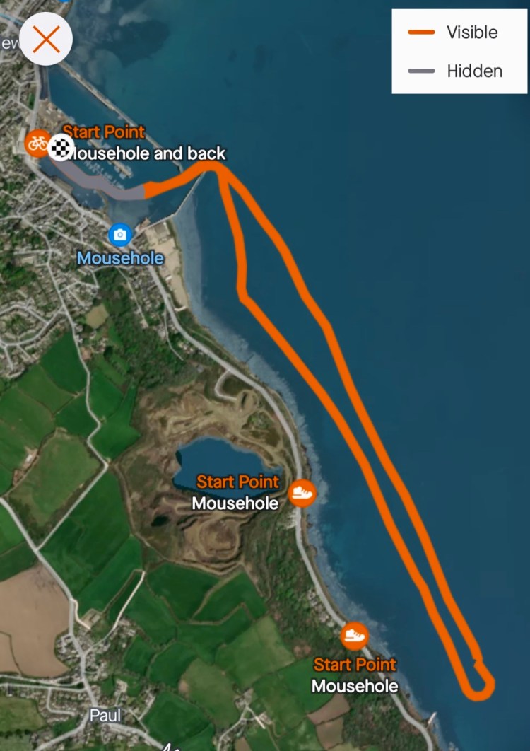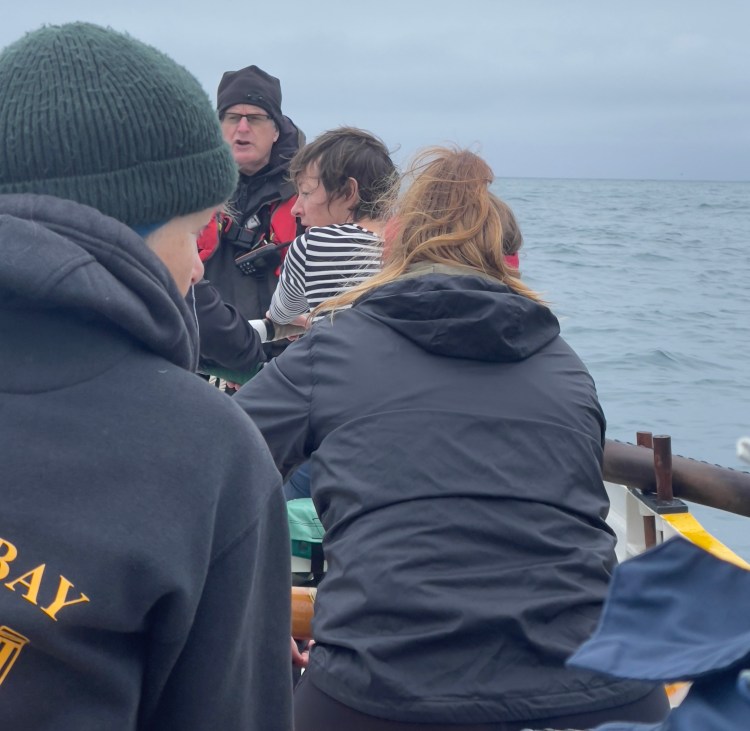 Nice row from Newlyn Harbour to the old Penlee lifeboat house near Mousehole. Practising technique on choppy seas. Cox: Bernard, 6: Rebecca, 5: Liz, 3:Nicola, 4: Pat, 5: Shirley, 6: Me