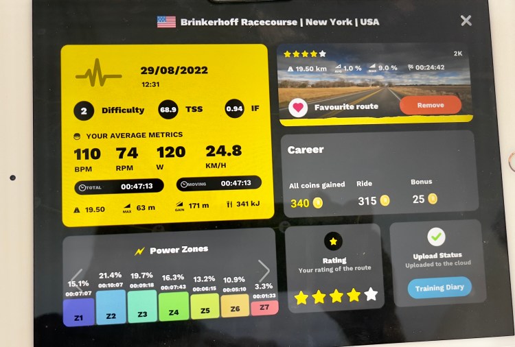 29.4km and 47 min virtual cycle ride on the ROUVY Brinkerhoff Racecourse undulating route in NewYork USA Average speed around 25 km/hr on WattBike