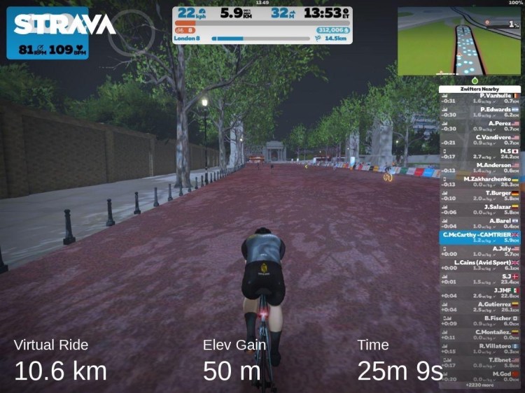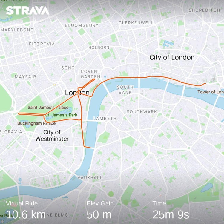 28 February 2022: 10.6 km virtual bike ride on Zwift London route