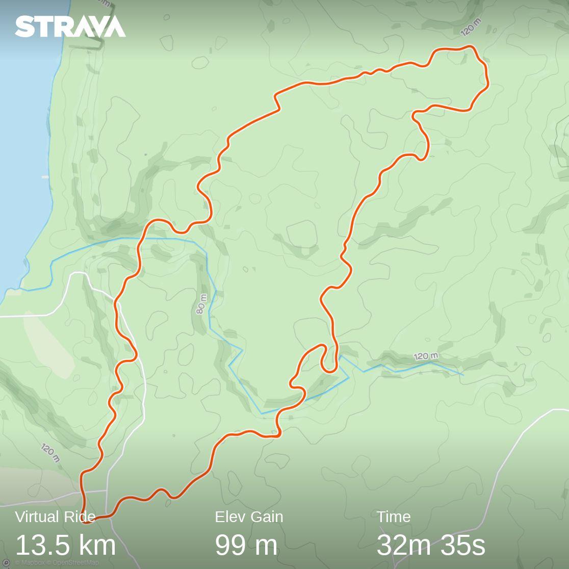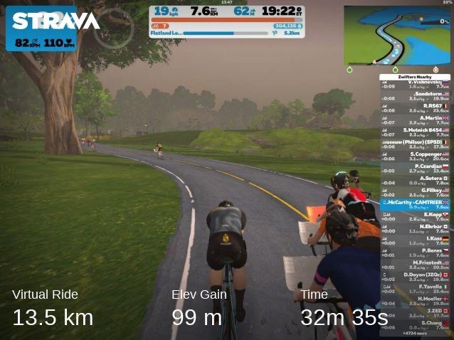 Quick 13.5 km & 32 minute virtual flat bike ride through this interesting course with a number of other riders. Average speed 25 km/hr with average power 117 watts. Elevation 99m