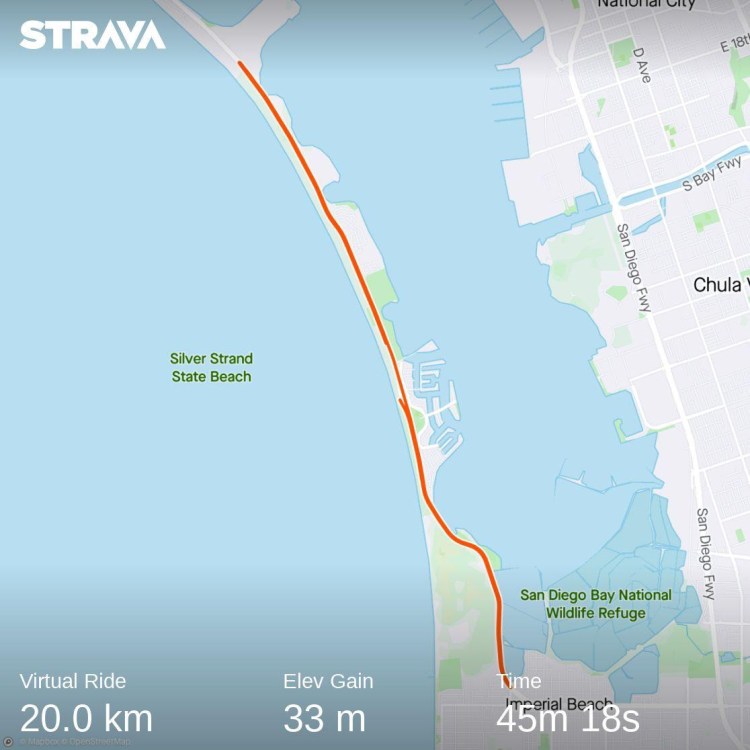 Good long virtual bike ride on the flattish ROUVY San Diego route. Visited San Diego on a DIA conference as well as visiting the PPD office. Beautiful climate for swim, bike and run. Love to do a triathlon here.